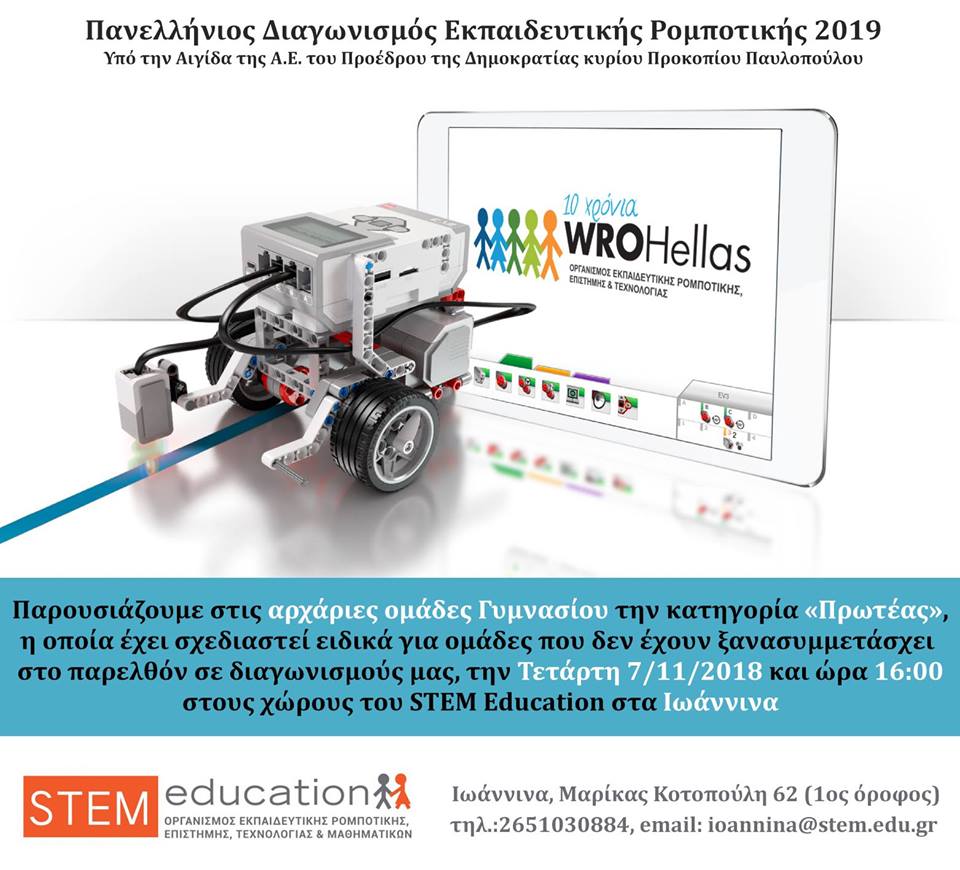 Νωρίτερα είχε πραγματοποιηθεί με επιτυχία στις 23/11/2018, στο 7ο Δημοτικό Σχολείου Χίου επιμόρφωση – εργαστήριο για την ανοικτή κατηγορία Δημοτικού με θέμα «Αρχιπέλαγος Αιγαίο: Η τεχνολογία βοηθά να αναπτυχθούν τα νησιά» του Πανελλήνιου Διαγωνισμού Εκπαιδευτικής Ρομποτικής 2019 της WRO Hellas. Το εργαστήριο διοργανώθηκε από τον Συρρή Ιωάννη, Συντονιστή Εκπαιδευτικού Έργου Εκπαιδευτικών ΠΕ86, 2ο ΠΕ.Κ.Ε.Σ. Β. Αιγαίου, με επιμορφωτές τους: