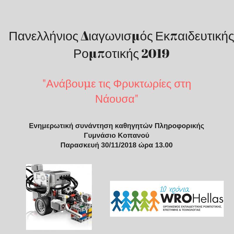 Στις 30/11/2018 πραγματοποιήθηκε στο Γυμνάσιο Κοπανού, σεμινάριο εκπαιδευτικής ρομποτικής με τη συμμετοχή καθηγητών Πληροφορικής της Περιφερειακής Ενότητας Ημαθίας και μαθητών από το 1ο Γυμνάσιο Νάουσας. Οι συμμετέχοντες ενημερώθηκαν για τη συμβολή της εκπαιδευτικής ρομποτικής στη μάθηση, για τον Πανελλήνιο Διαγωνισμό Ρομποτικής του WROHellas και πειραματίστηκαν με το ρομπότ στο εργαστήριο που διεξήχθη μετά το τέλος του σεμιναρίου. Οι μαθητές ενθουσιάστηκαν, συνεργάστηκαν και προγραμμάτισαν μόνοι τους το ρομπότ στις δοκιμαστικές πίστες “Πρωτέας” και “Δρόμοι του κρασιού”. Την παρουσίαση έκανε η πρεσβευτής WRO Hellas του Νομού Ημαθίας και καθηγήτρια πληροφορικής του Γυμνασίου Κοπανού κ. Λαζάρου Βασιλική με τη βοήθεια του μαθητή της Παναγιώτη Γιαλαμά, ο οποίος για δεύτερη φορά θα λάβει μέρος στον Πανελλήνιο Διαγωνισμό Ρομποτικής. Στην επιτυχημένη συνάντηση συμμετείχαν 40+ άτομα, κυρίως μαθητές.