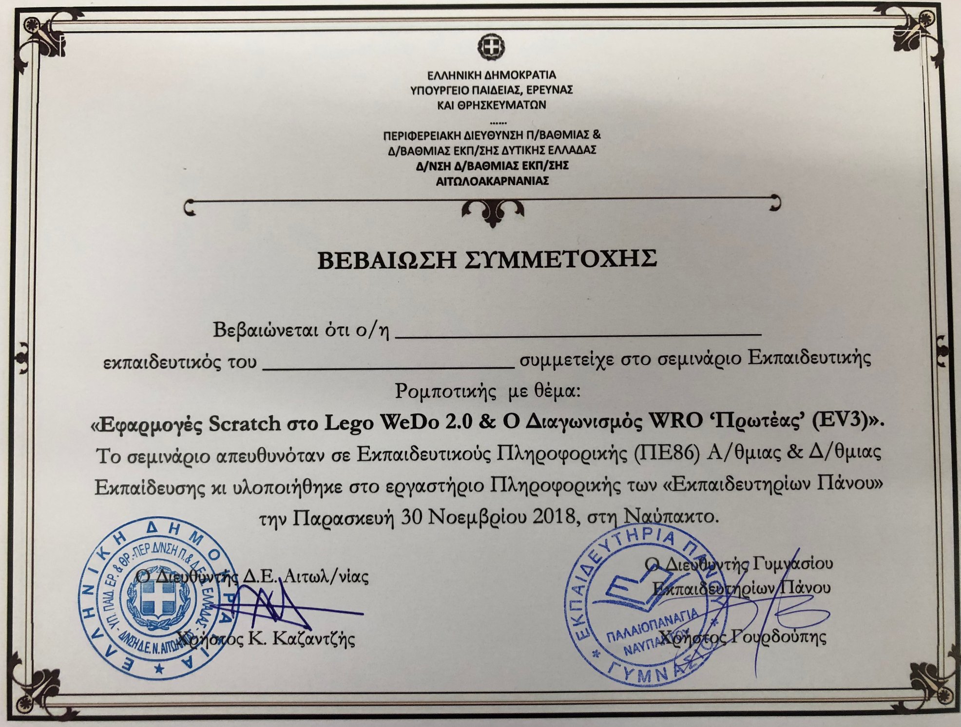 Στις 30/11/2018 άναψαν οι φρυκτωρίες και στη Ναύπακτο, όπου πραγματοποιήθηκε στο Εργαστήριο Πληροφορικής των Εκπαιδευτηρίων Πάνου, σεμινάριο με θέμα «Εφαρμογές Scratch στο WeDo 2.0 & ο Διαγωνισμός WRO ‘Πρωτέας’» με εισηγητές τους Τσοβόλα Σπύρο (Υπεύθυνος ΕΚΦΕ Αγρινίου), Πάνο Βέρρα (Stem Education Patras) και Σωτηρόπουλο Σωτήρη (Καθηγητής Πληροφορικής Εκπαιδευτηρίων Πάνου). Στο σεμινάριο συμμετείχαν 10 εκπαιδευτικοί Πρωτοβάθμιας και Δευτεροβάθμιας εκπαίδευσης.