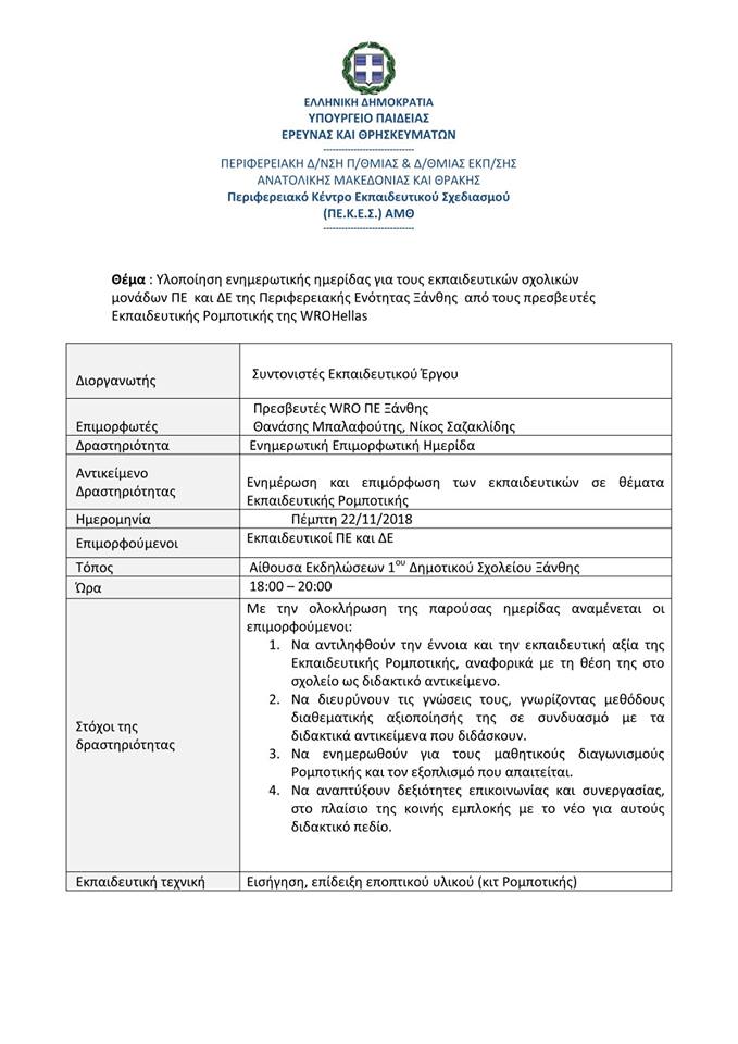 Με μεγάλη επιτυχία επίσης, πραγματοποιήθηκε την Πέμπτη 22/11/2018 η ενημερωτική ημερίδα για την Εκπαιδευτική Ρομποτική της περιφερειακής ενότητας Ξάνθης. Οι 100 περίπου εκπαιδευτικοί της Πρωτοβάθμιας και Δευτεροβάθμιας Εκπαίδευσης που παραβρέθηκαν στο 1ο Δημοτικό Σχολείο Ξάνθης είχαν την ευκαιρία να έρθουν για πρώτη φορά σε επαφή με έννοιες της Εκπαιδευτικής Ρομποτικής και να μοιραστούν το μεράκι, την τεχνογνωσία στην οργάνωση μαθήματος και την εμπειρία των διαγωνισμών από τους Πρεσβευτές WRO Hellas Θανάση Μπαλαφούτη και Νίκο Σαζακλίδη. Η ημερίδα οργανώθηκε με την υποστήριξη των Συντονιστών εκπαιδευτικού έργου της Περιφέρειας Ανατολικής Μακεδονίας και Θράκης.