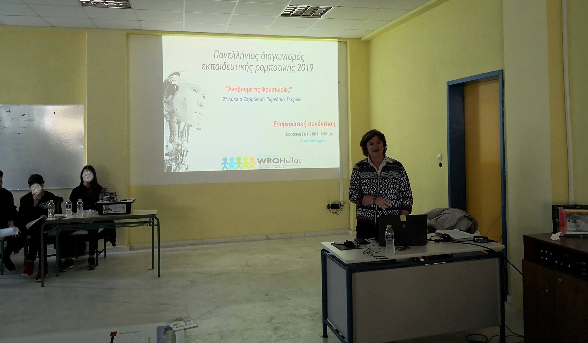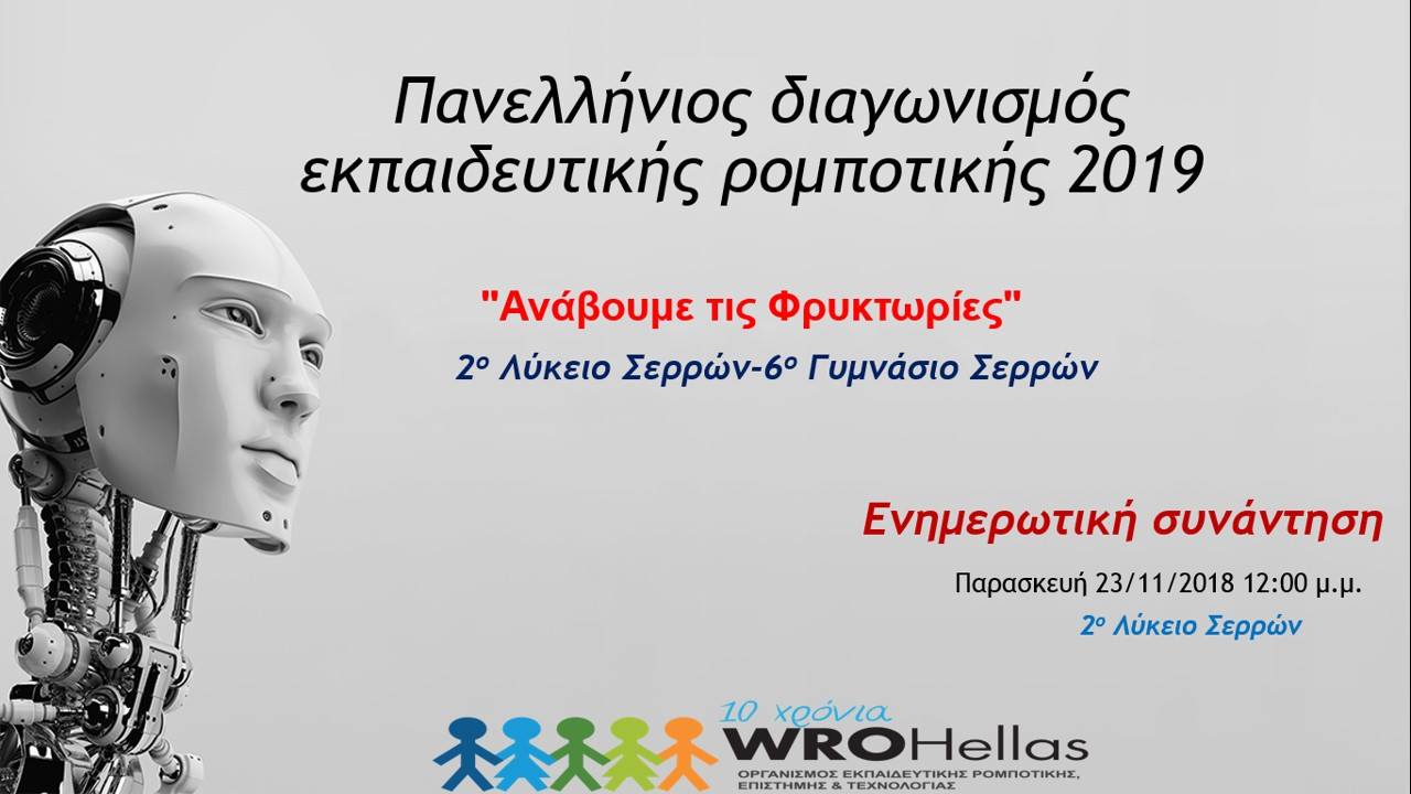 Στις 23/11 οι φρυκτωρίες άναψαν και στις Σέρρες, όπου έγινε ενημερωτική συνάντηση στο χώρο του 2ου Λυκείου Σερρών παρουσία μαθητών του 2ου Λυκείου, 6ου Γυμνασίου και 3ου Γυμνασίου Σερρών, με σκοπό την εισαγωγή των αρχάριων ομάδων στις προκλήσεις του διαγωνισμού, καθώς και ενημέρωση για την εκπαιδευτική ρομποτική και τον πανελλήνιο διαγωνισμό εκπαιδευτικής ρομποτικής 2019, από τους πρεσβευτές Αγγειοπλάστη Αθανάσιο και Αρβαντά Αγγελική.
